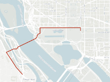 The military parade starts at the Pentagon, then crosses the Memorial Bridge spanning the Potomac River as it proceeds down Constitution Avenue past the presidential viewing and live concert stand at the Ellipse, ending on 15th street.