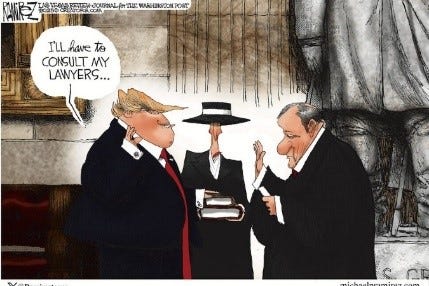 We the People await the next exciting chapter in the Clash of the Titans (between the imperial executive and his corrupt high court). Will the 7-2 margin of sanity and sound jurisprudence hold? Will Thomas and Alito be allowed to continue to participate? Stand by time on these questions likely will be brief.