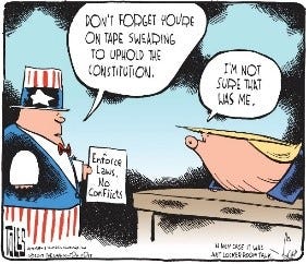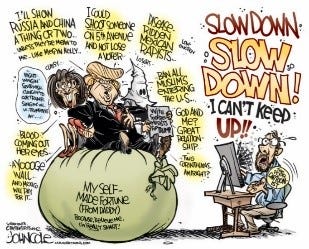 Consider making more “good trouble.” Go on the offensive. Enough willful and clearly self-serving damage has been done to justify a pleading against The Guy in equity for restitution of funds unjustly gained for personal use. The Trump v United States decision leaves him open to prosecution for objectionable private acts. His public stock investment advice is suspect. His crypto investor dinner is on shaky ground. The Qatar jet as a library acquisition is weak. The very filing of such complaints, in any applicable jurisdiction, would distract and seriously disturb the Trump 2.0 Magic Show.