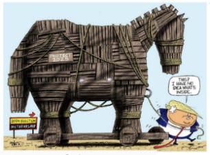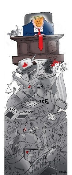 As before, the House may find a way to fashion an Article that falls outside the umbrella of immunity granted by the Supreme Court; the likelihood of the Senate removing a sitting president from office is slim. The cartoon meant only to note the sensitivity of the president to another assault on his brand. That’s what his mid-term maneuvering signals.