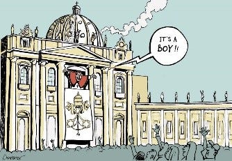 Later processions avoid the spot of delivery. The Vatican removed her from the official list of pontiffs. And created a procedure in the coronation of a new pope that assured acceptable gender. A person elected to be pope was forced to strip from the waist down and sit in a chair with a hole cut in the seat. A physician would confirm the presence of dangling male genitalia. After a successful examination, the examiner would announce to the crowd “Duos habet et bene pendentes! (He has two [testicles] and they dangle nicely.)”