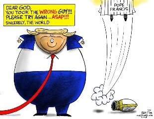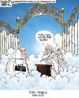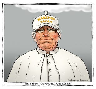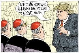 Trump's declaration of his rise to Pope may take a different path when he attends the funeral and sees for himself 1) He doesn't even get one of the "good seats" up front with world leaders he just pissed off, 2) He wasn't invited into the room to pick a Pope (location, location, location), and 3) All emphasis and unity of the crowd is for the Pope. Trump is nothing more than another person in the crowd coming to this once-in-a-lifetime moment. (250,000 attending the mass and another 150,000 along the motorcade to the funeral mass)