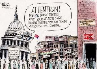 The same fateful day, a panel of three federal judges threw a spanner in one of the works of the Mad King’s most outrageous and public attempts to rig the 2026 election results in his favor. The panel blocked Texas from using midterm census data to draw a new congressional map for the 2026 elections. The map was created to give the Republican party an additional 5 seats in the House. The decision of the 2-1 majority cited evidence that the map was an illegal racial gerrymander that diluted minority voting power. The court ordered Texas to use the 2021 map instead. Texas immediately appealed the decision to the partisan U.S. Supreme Court.