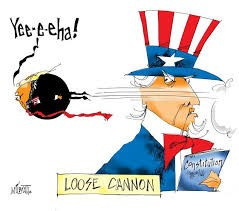 In a mystery of our times, all knees at home and abroad bend to his gleeful lawlessness. His willfully toxic brand is a loose cannon aboard the dearly beloved ship Democracy.