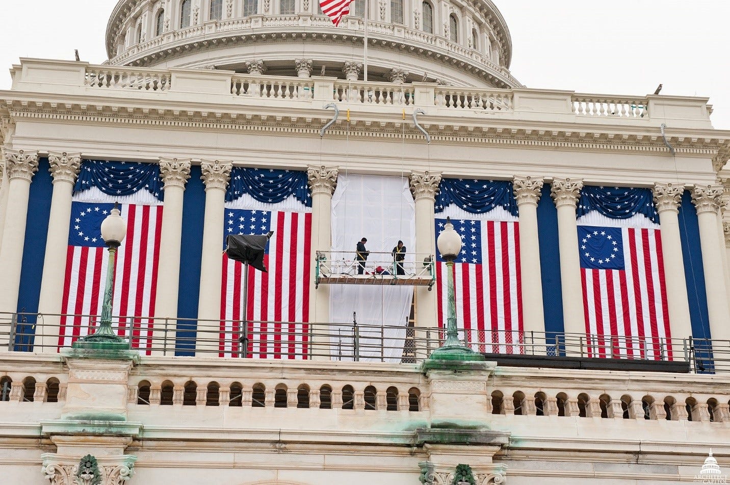 Traditionally—and, therefore, totally up for grabs by the Shock Jock in Chief--the Betsy Ross flag is flown in the two outside bays behind the new President as he (or she or it) delivers his (or her or its) inaugural address to the nation and the world.