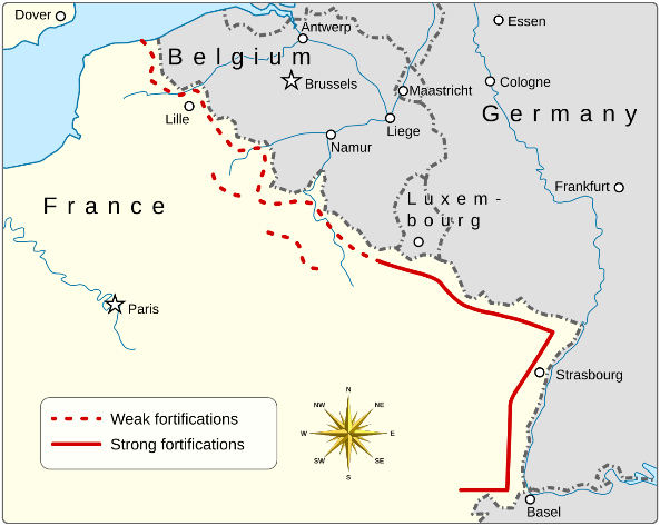 Constructed on the French side of its borders with Italy, Switzerland, Germany, Luxembourg and Belgium, the line did not extend to the English Channel. French strategy, therefore, envisioned a move into Belgium to counter a German assault…French military experts believed the line would deter German aggression because it would slow an invasion force long enough for French forces to mobilise and counterattack.