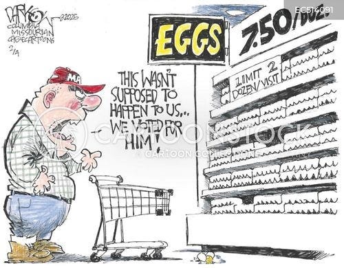 The first of Duplicitous Donny’s failed campaign promises was when egg prices did not respond favorably to market forces or hasty supplemental (infrequently reported) funding programs.
